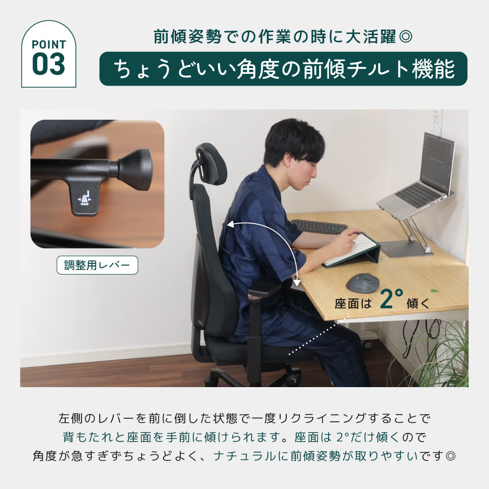 自然な前傾姿勢が取れるので、勉強や仕事での利用にも