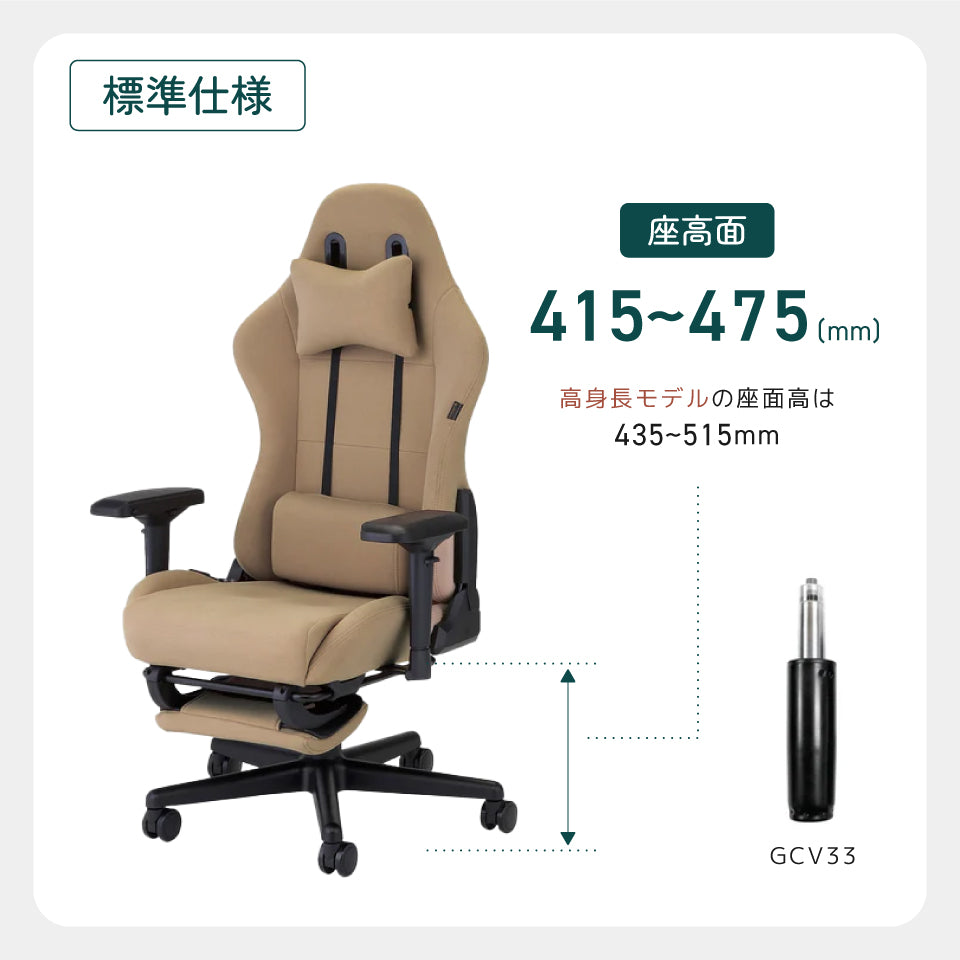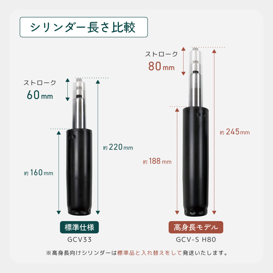 高身長向けシリンダーのセット販売(+1800円)をしております。通常シリンダーより座面を約40mm高い位置に調整することが可能です。