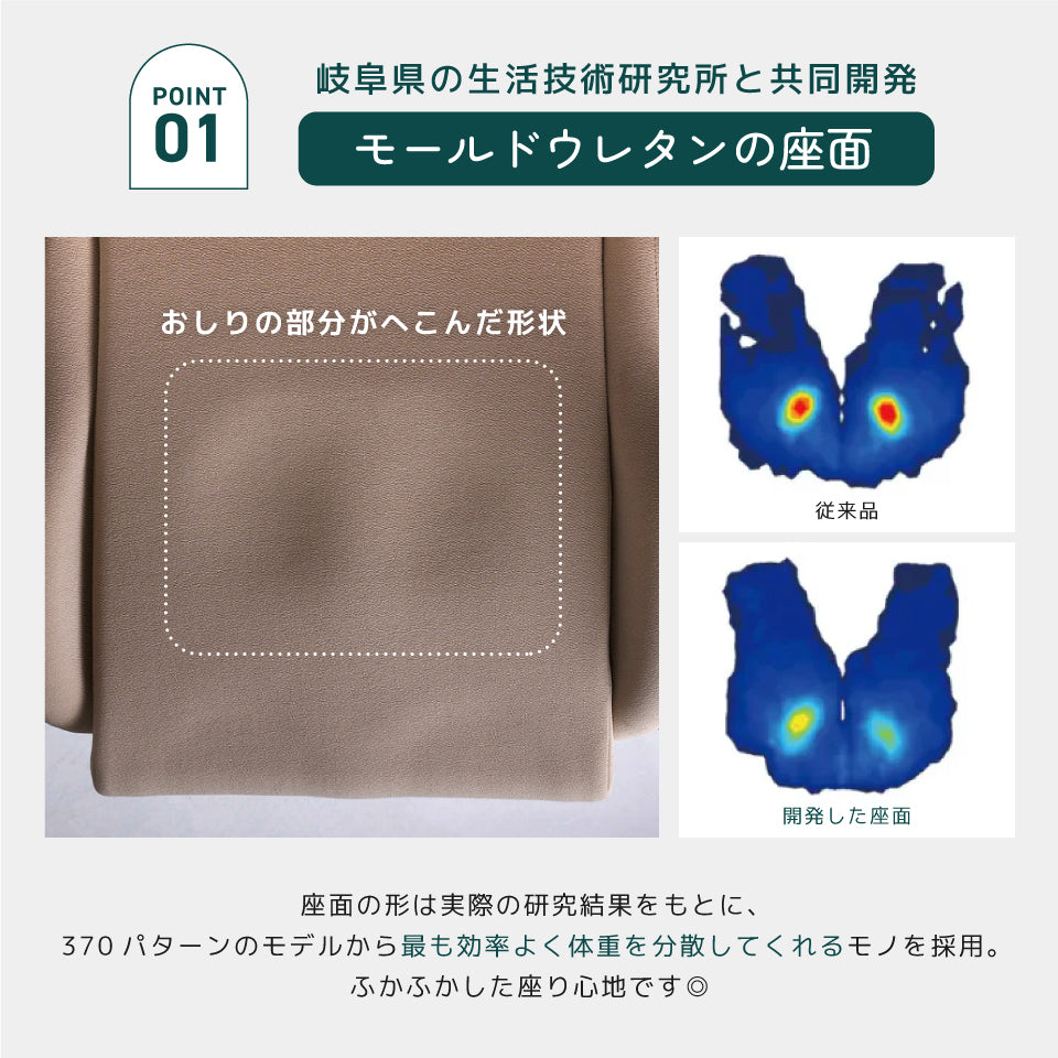 座面の形は実際の研究結果をもとに、370パターンのモデルから最も効率よく体重を分散してくれるモノを採用。もちろんモールドウレタンです。