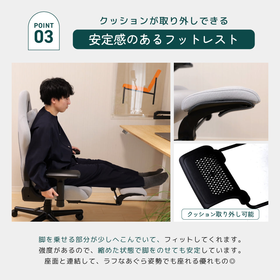 フットレストは、足を置いてリラックスできるだけじゃなく、座面と連結してスペースを拡大。ラフなあぐら姿勢でも座れる優れもの。